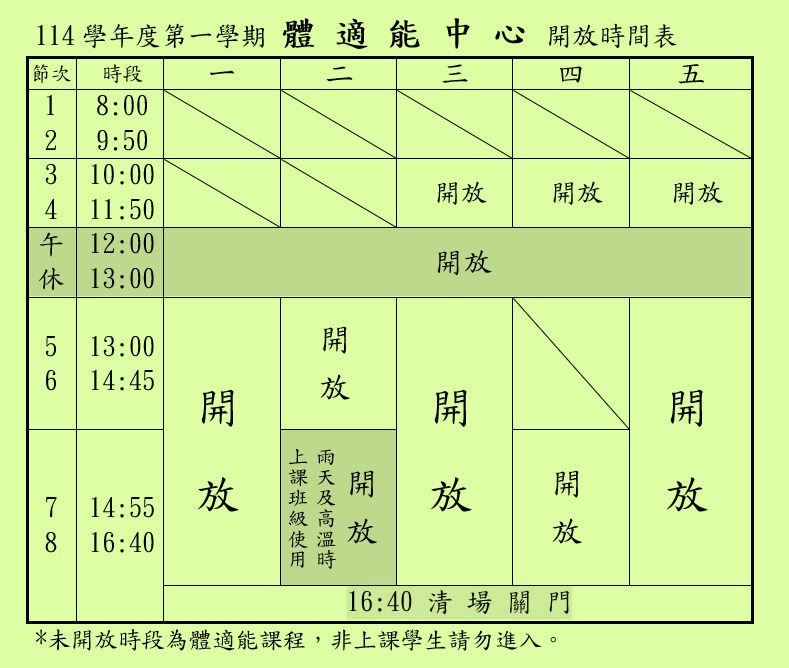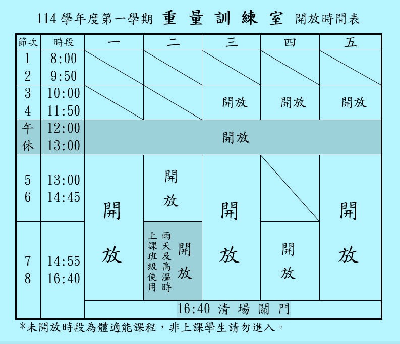 三、体适能中心、重量训练室,开放时段(1/12起,恢复时间为16:40清场关门)。