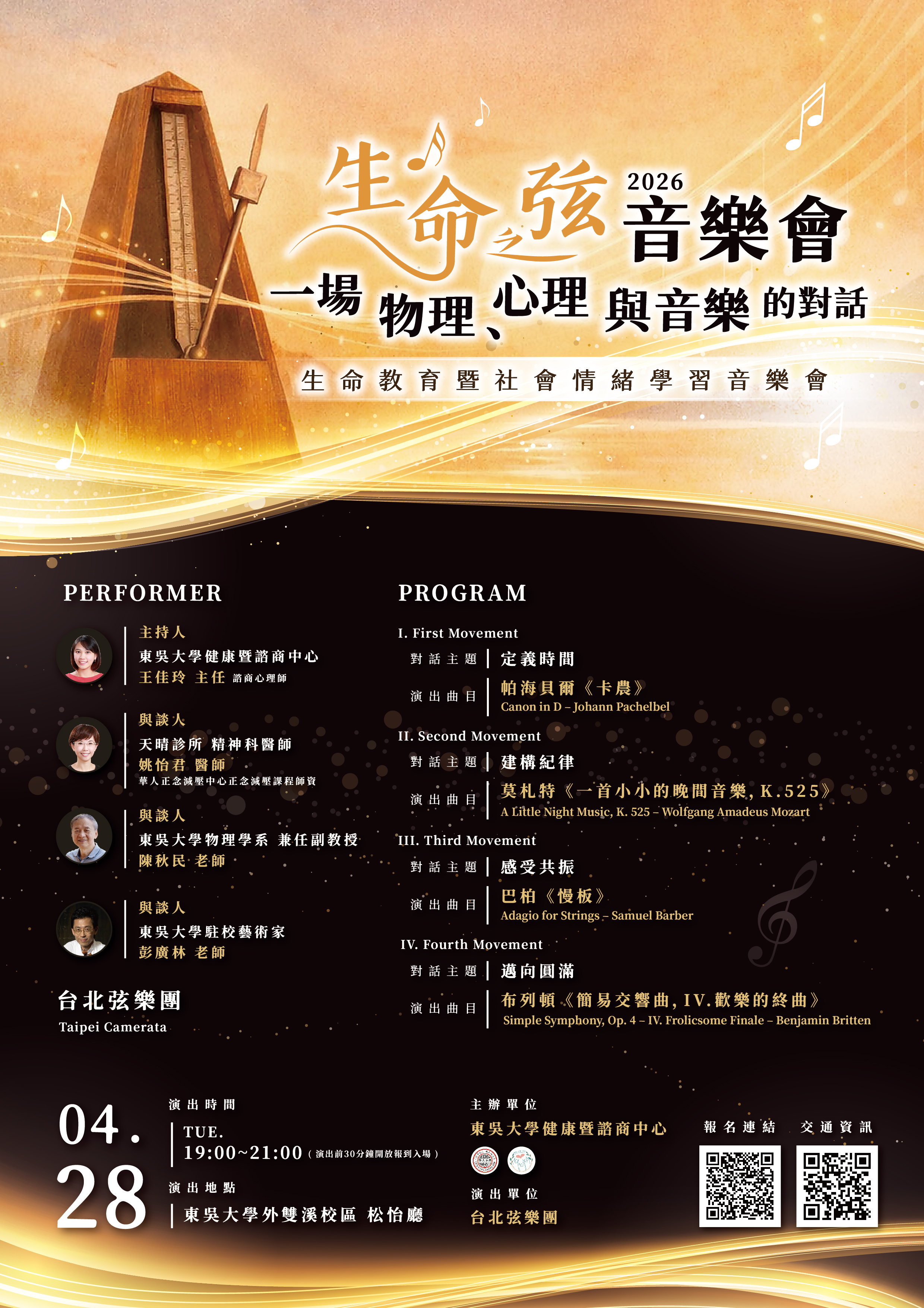 一、 為推動生命教育並實踐社會情緒學習(SEL)之精神,本校謹訂於115年4月28日(星期二)舉辦旨揭音樂會。本次活動特邀「台北弦樂團」擔綱演出,並透過物理、心理與音樂之跨領域對話。